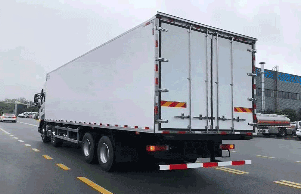 | 其他 | 隨底盤選裝僅高度不同的駕駛室,高頂駕駛室頂部氣喇叭為選裝件,駕駛室前角擾流板為選裝件,選裝單油箱或雙油箱;貨廂選裝單開門,雙開門和不開門型式;選裝其它廠家功率相當的制冷機組,選裝前置式,內置式,底置式制冷機組;選裝升降尾板,尾板收起狀態時的水平長度為295mm;廂體頂部封閉,不可開啟;側防護:材料Q235,螺栓連接;后下防護:材質Q235.螺栓連接,斷面尺寸120×60mm,離地高度460mm;安裝具有衛星定位功能的行駛記錄儀;裝有ABS,ABS型號/生產廠家:ABS 8/東科克諾爾商用車制動系統(十堰)有限公司;發動機DDi11E465-60對應油耗申報值37.1L/100km. | ||